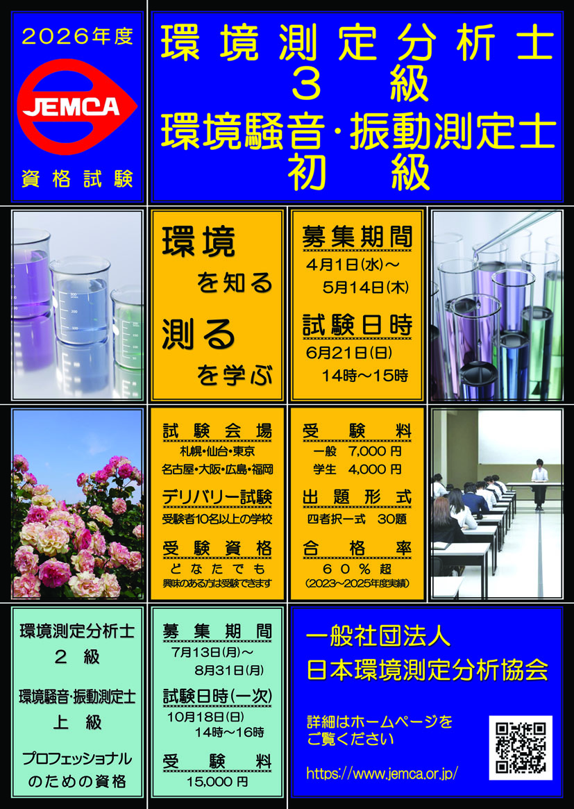 受験申込み方法等詳細は、 環境測定分析士、環境騒音・振動測定士 のページをご覧ください。