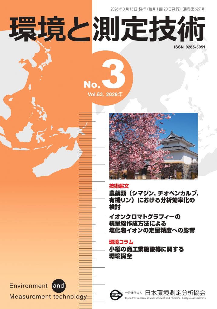 <2026年3月号 トピックス> 【技術報文】 農薬類(シマジン,チオベンカルブ,有機リン)における分析効率化の検討 一般財団法人広島県環境保健協会 井原名美,三井裕美,勝谷芳生 イオンクロマトグラフィーの検量線作成方法による 塩化物イオンの定量精度への影響 東ソー株式会社 バイオサイエンス事業部 カスタマーサポートセンター 佐藤真治,小林善美 【お仕事紹介】 日々の気づきを大切に。点と点を結び,社会への貢献を形に。 日本環境分析センター株式会社 大阪本社・神奈川支社・東京営業所 松井 円 【表紙写真】 撮影:林 敏夫 (株)島津テクノリサーチ 写真のタイトル【甲府城と桜】 ※撮影者からのコメント(巻末に掲載)もぜひお読みください。 |